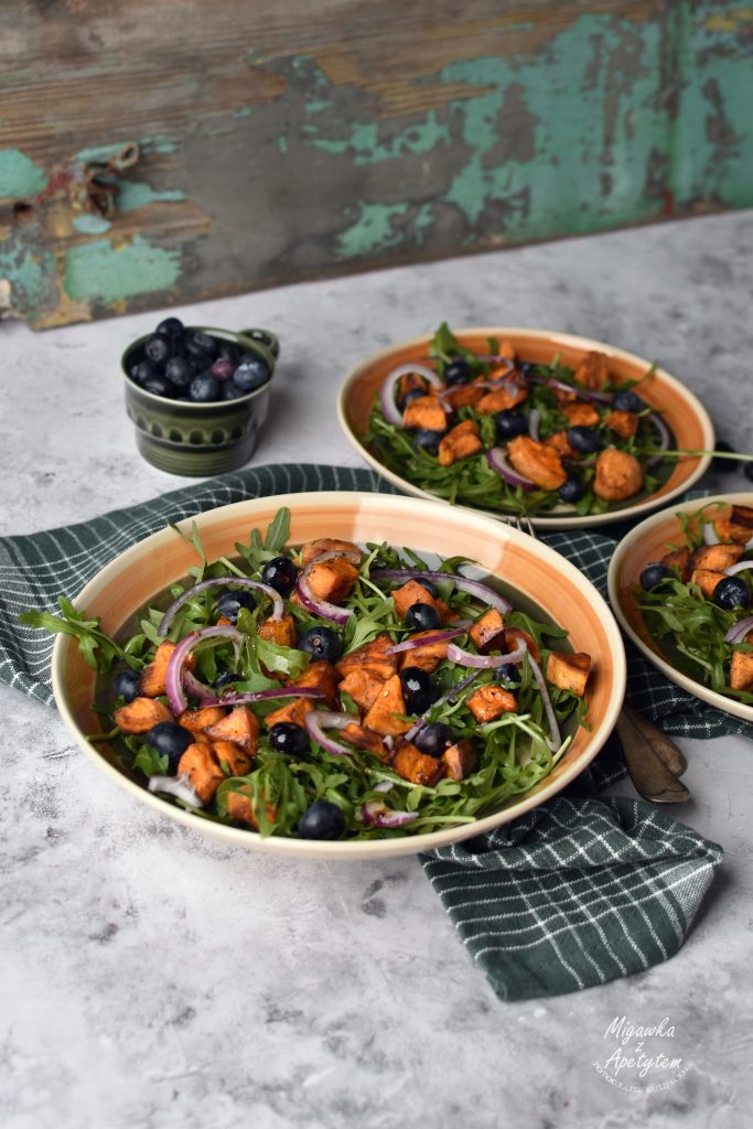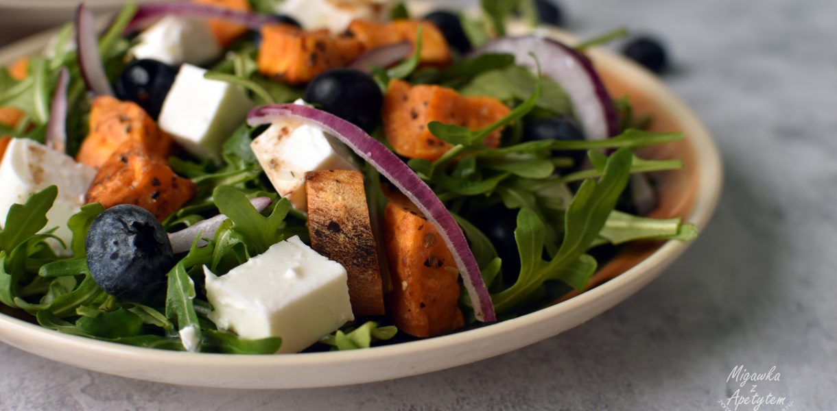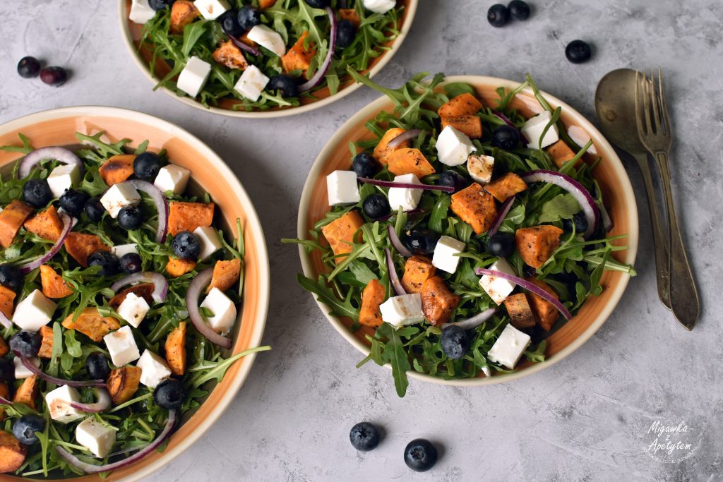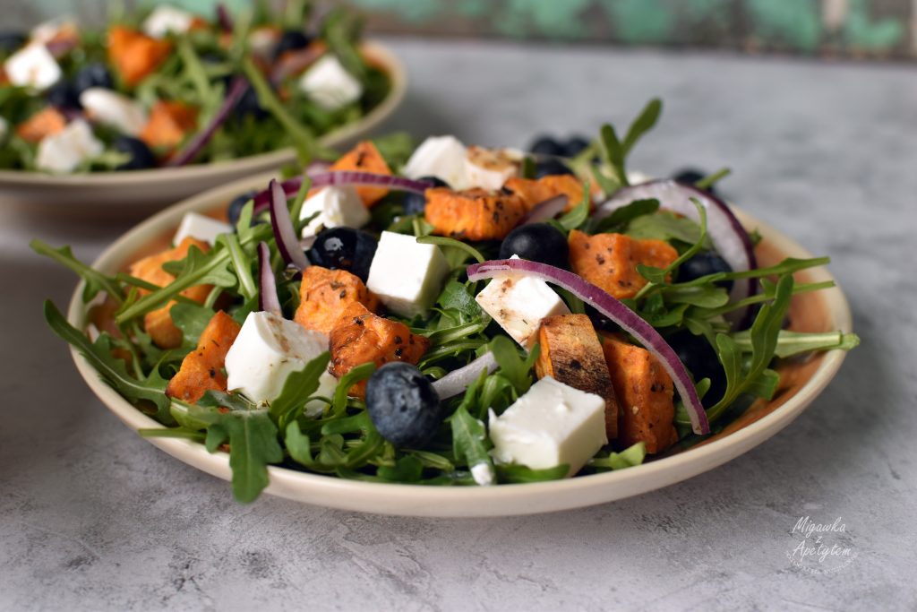 Na półmisek wykładamy rukolę, bataty, ser, borówki i cebulę. Wszystko polewamy sosem.