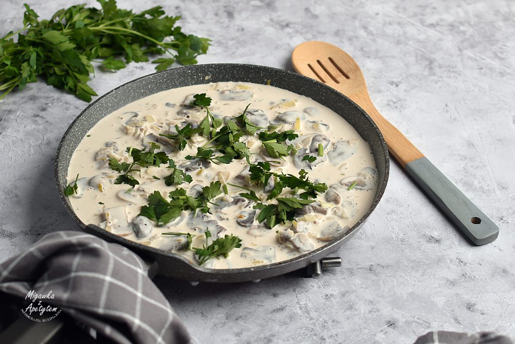 Podanie: Nakładamy na talerze porcje makaronu, polewamy sosem pieczarkowym i posypujemy świeżą natką pietruszki. Smacznego!