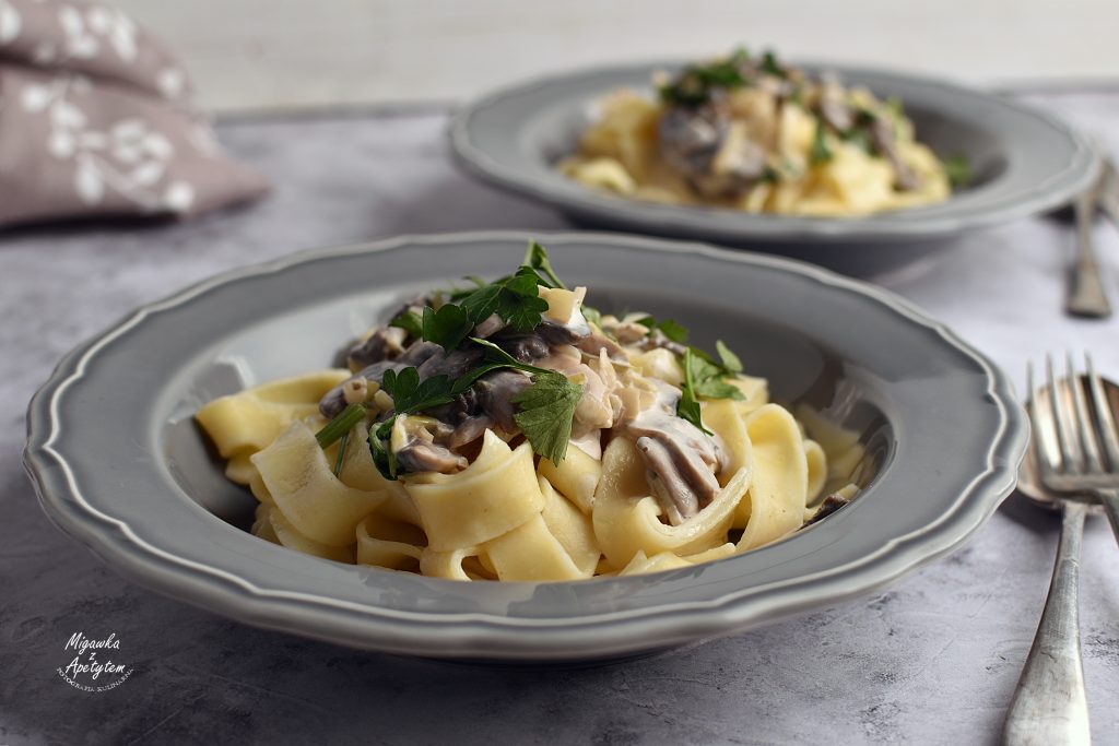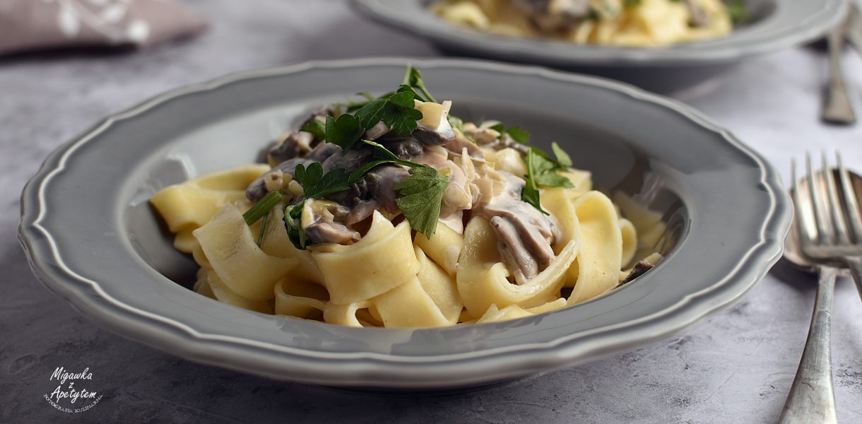 Makaron z sosem śmietanowo – pieczarkowym