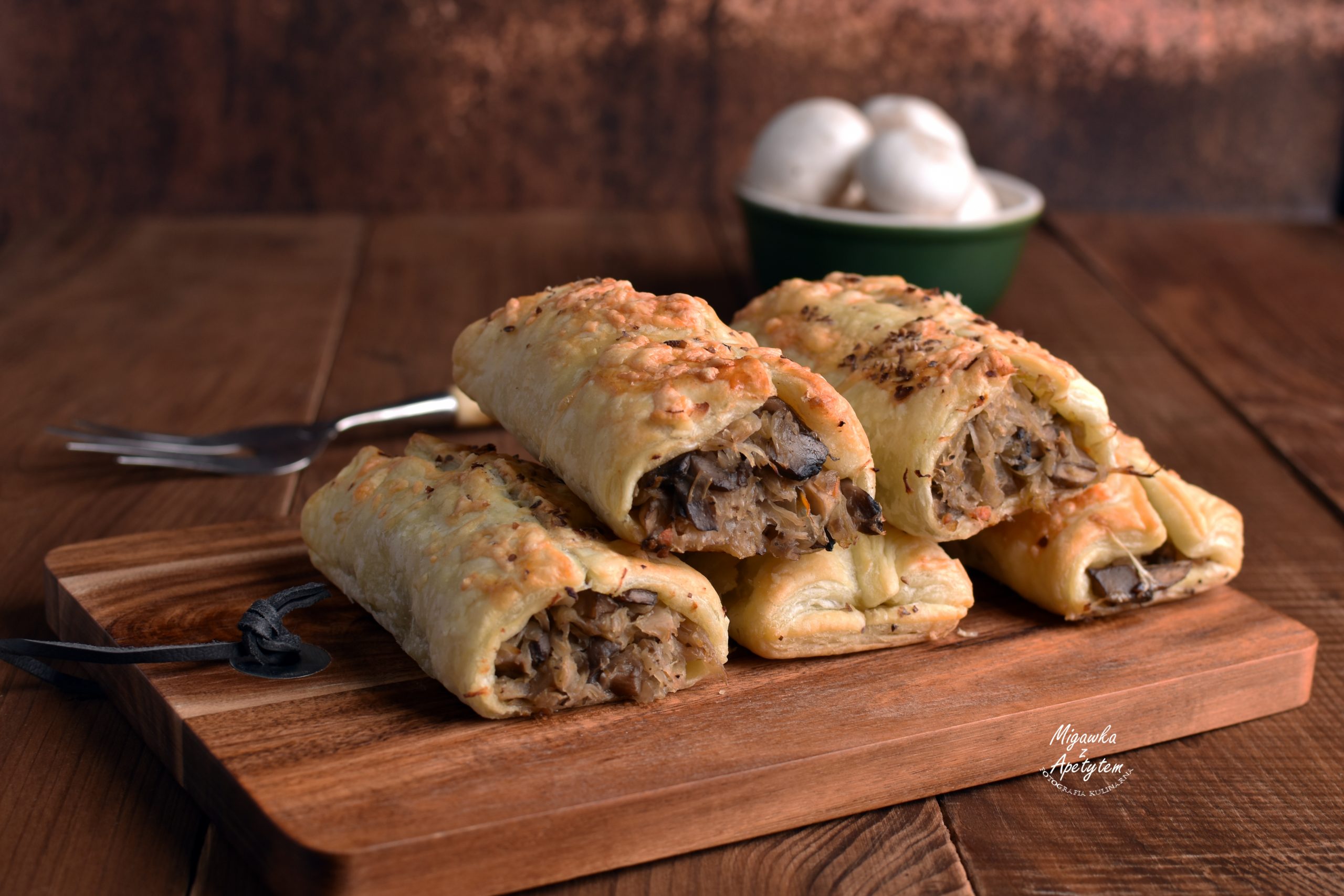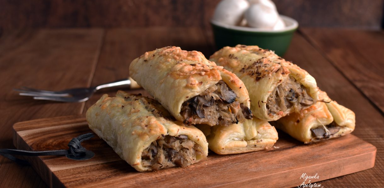 Kapustę kiszoną przepłukać pod bieżącą wodą, odcisnąć i posiekać. Włożyć do garnka zalać wodą do przykrycia kapusty. Dodać ziele angielskie i liść laurowy. Gotować 45 minut. Pieczarki obrać, pokroić w kostkę, posolić i poddusić na patelni bez dodatku tłuszczu. Cebulę obrać, pokroić w kostkę i zeszklić na patelni z odrobiną oleju. Ugotowaną kapustę odcedzić. Przełożyć do miski. Dodać uduszone pieczarki i zeszkloną cebulę. Wymieszać dodając do smaku sól, pieprz i słodką paprykę. Ciasto francuskie rozwinąć i przekroić na pół wzdłuż dłuższej krawędzi. Na każdą z części wyłożyć farsz. Zakleić brzegi ciasta u góry krokietów. Każdy z kawałów przekroić na 3-4 równe części.