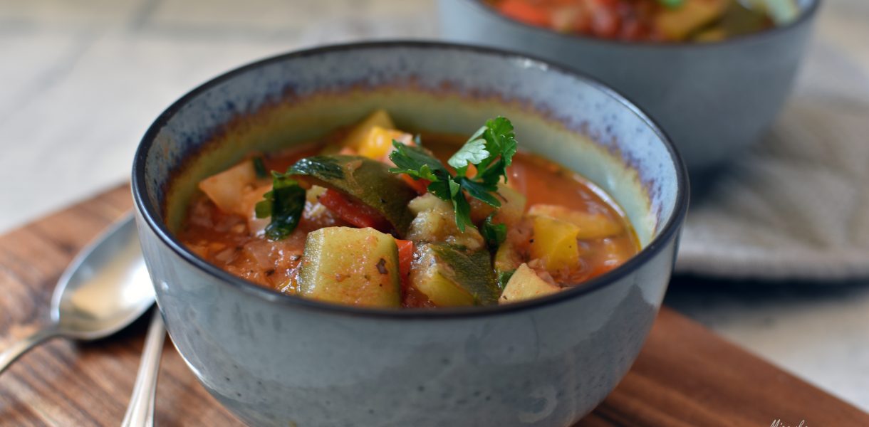 Cebule obrać, pokroić w grubszą kostkę. Na głębokiej patelni o grubym dnie rozgrzać dwie łyżki oleju. Wrzucić pokrojoną cebulę i zeszklić. Paprykę umyć, usunąć gniazda nasienne i pokroić w ok. 1-2 cm kostkę. Czosnek obrać, pokroić w cienkie plasterki. Dodać do cebuli i chwilę podsmażać razem. Dodać pokrojoną paprykę. Cukinię myjemy i odcinamy końcówki. Następnie kroimy w ok. 1 cm plastry, a następnie w kostkę. Gdy papryka już nieco zmięknie dodajemy pokrojoną cukinię. Chwilę podsmażamy i dolewamy pół szklanki bulionu lub wody. Jeżeli dodaliśmy wodę już teraz możemy dosypać pół łyżeczki soli i 1/4 łyżeczki pieprzu. Przykrywamy i dusimy, często mieszając. Gdy cukinia nieco zmięknie dodajemy całe pomidory z puszki wraz z zalewą. Dusimy od czasu do czasu mieszając i rozdrabniając łyżką pomidory w potrawie. Pietruszkę szatkujemy i dodajemy do potrawy. Część możemy zostawić do podania. Gdy pomidory połączą się z potrawą dodajemy suszone zioła: 3 łyżeczki oregano, dwie łyżeczki słodkiej papryki, po pół łyżeczki tymianku, cząbru lub bazylii, poł łyżeczki kolendry lub ziół prowansalskich. Zioła możemy użyć w zmiennych proporcjach lub wymiennie zależnie od naszych preferencji. Podduszamy jeszcze chwilę, aż zioła połączą się z potrawą, następnie doprawiamy wedle uznania solą i pieprzem. Smacznego!