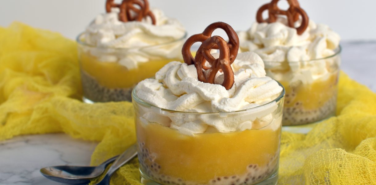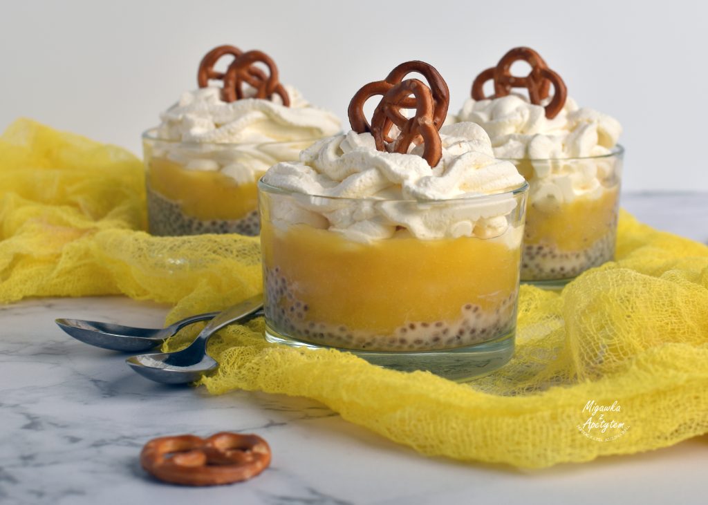 Do miski wsypujemy nasiona chia i zalewamy mlekiem. Odstawiamy do lodówki na minimum 6 h. Po tym czasie Śmietankę, serek mascarpone i cukier puder przekładamy do wysokiej miski i wstawiamy do lodówki. Obieramy mango ze skórki, a miąższ blendujemy na gładką masę. Przekładamy do miseczek po równo nasion chia, następnie delikatnie nakładamy w równej ilości miąższ z mango. Odstawiamy do lodówki. wyjmujemy miskę ze składnikami na krem i miksujemy zaczynając od najmniejszych obrotów, stopniowo przechodząc na najwyższe, aż masa stanie się sztywna. Przekładamy do rękawa cukierniczego. Wyjmujemy desery na każdy z nich wyciskamy po porcji kremu na koniec ozdabiamy preclami.
